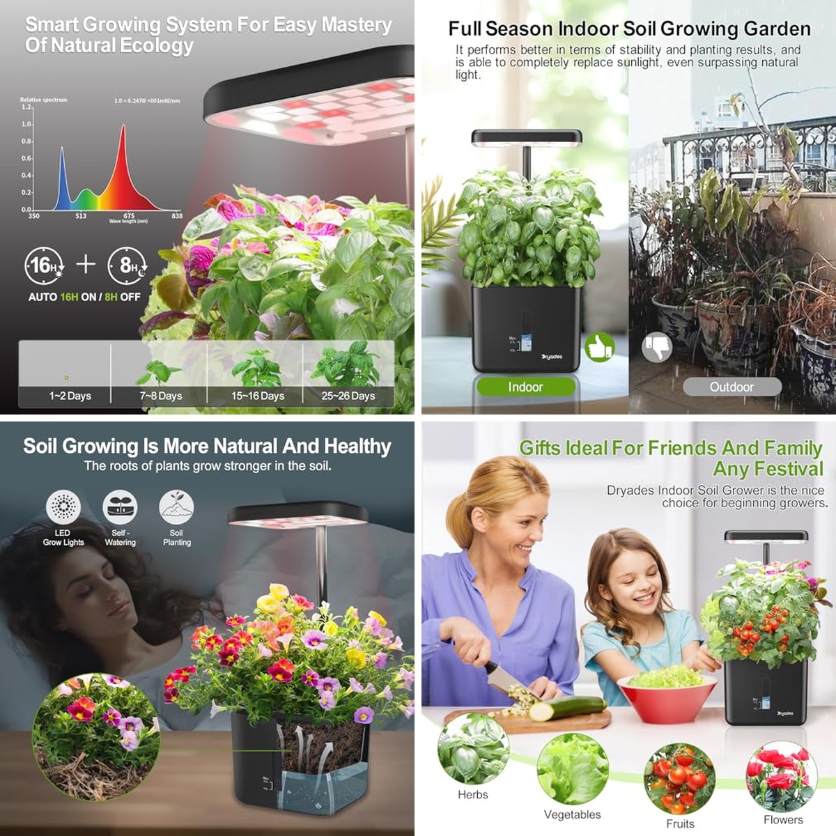 - Smart Hydroponics Herb Garden Kit – This kit automates indoor herb growing for up to eight pods with an integrated LED light.